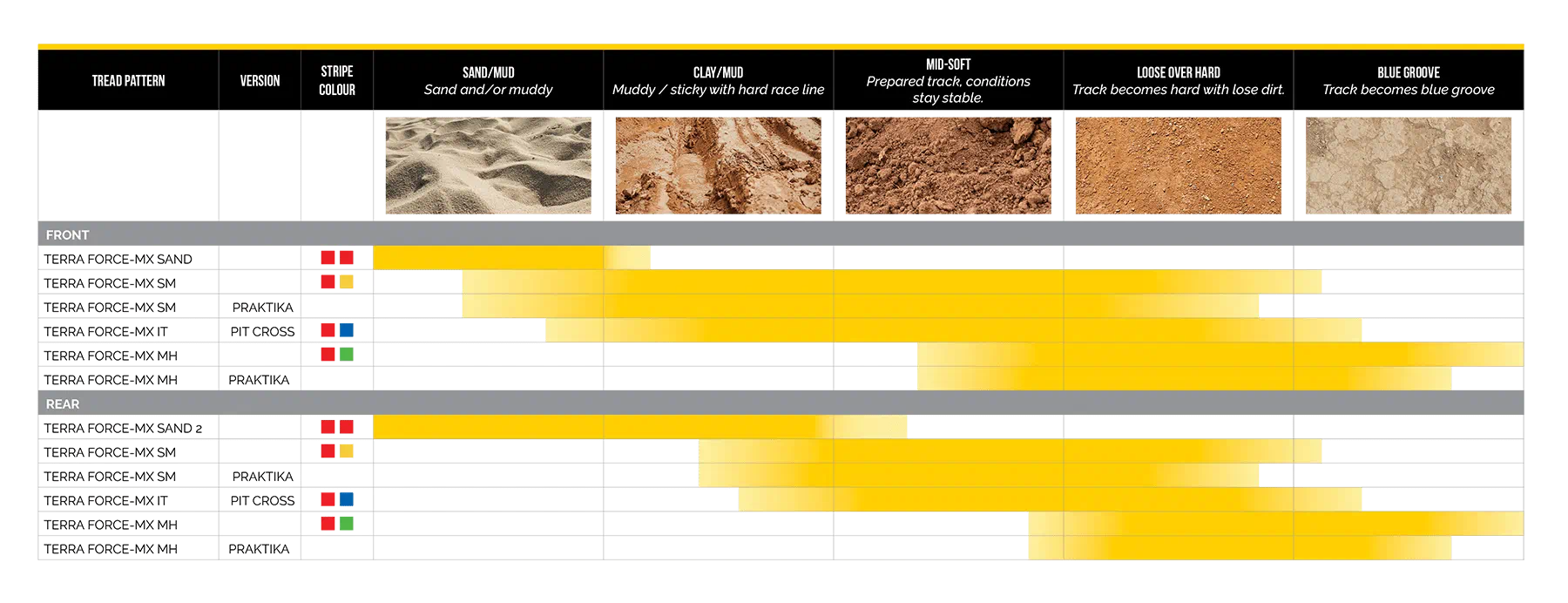 TERRA FORCE-MX SAND har en djupt chevronformad paddeldesign som är perfekt för djup, mjuk sandig terräng och lera, med en stor avstånd mellan klackarna som ger en trygg körning utan att göra avkall på stabiliteten, även i spårig terräng. FRAMDÄCKET är utformat för att säkerställa maximal kurvtagning och bromskontroll i samma terrängtyper.